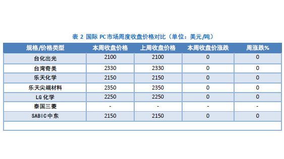 本周国内PC 市场分析 本周国内PC 市场延续弱势,跌势较前期稍缓,场内业者心态多谨慎。分区域来看,华东市场弱势走低, 各主流牌号跌幅在200-500 元/吨;华南市场报盘重心走低,各主流票号跌幅在100-400 元/吨,部分牌号因 货源供应情况周内涨250 元/吨,后因市场疲软持续走低。 周内市场气氛延续偏空,现货市场供应充足,但下游工厂入市采购意向有限,询盘意向寡淡,需求面跟 进疲软,贸易商走货承压,加之后市看空情绪浓厚,普遍让利出货,实盘商谈为主。周内华南市场部分牌号 受货源紧张影响,报盘走高250 元/吨,然终难敌市场疲弱的影响,报盘回落。国内PC 市场经过长期的下跌, 市场心态多谨慎,部分贸易商存备货建仓的心态,加之本月企业报盘均小幅让利,贸易商成本面稍显压力, 大幅走跌的意向有限,市场报盘跌势稍缓,市场报盘摸索探底。截止今日,华东注塑级中低端商谈参考 17100-19500 元/吨(含税),华南注塑级中低端商谈参考15300-17000 元/吨(不含税)。 华东地区:华东市场弱势走低,各主流牌号跌幅在200-500 元/吨。贸易商亏损操作下,场内主动性报 盘略显混乱,高报低出现象频现,市场心态疲弱,下游工厂买涨杀跌心态不减,接盘意向寡淡,市场整体仍 显疲弱,短期难言好转。截止今日,华东注塑级中低端商谈参考17100-19500 元/吨(含税)。 华南地区:华南市场报盘重心走低,各主流牌号跌幅在100-400 元/吨,周内华南地区台湾奇美110 受 企业装置检修的影响,导致货源供应紧张,市场报盘调涨250 元/吨,然需求疲软及业者看空心态影响,市 场报盘受压走低。短期市场内无利好支撑,业者心态难言乐观,加之下游需求影响,市场报盘以让利为主。截止今日,华南注塑级中低端商谈参考15300-17000 元/吨(不含税)。本周国际PC 市场分析