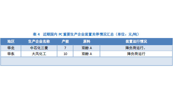 本周国内PC 生产企业供应分析 本周国内 PC 生产企业多有降负荷情况。大风化工 10 万吨/年 PC 装置减产运行,开工维持在 7 成左右; 利华益维远 10 万吨/年 PC 装置减产运行;鲁西化学 6.5 万吨/年 PC 装置开工维持在 8 成左右;中石化三菱 7 万吨/年 PC 装置减产运行,开工维持在 6、7 成左右。其余生产企业暂维持正常运行。鲁西化工二期新增 13 万吨/年 PC 装置计划于四季度投产。四川中蓝新材料新增 10 万吨/年 PC 装置计划于 12 月底投产。PC 供应篇