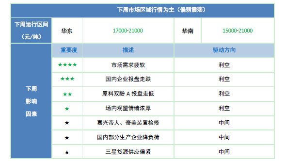 本周PC 的主要上游双酚A 市场大幅走跌,下游需求面跟进不足,加之上游苯酚价格回落,成本面支撑 疲软,场内看看气氛浓郁,贸易商多跟低销售为主。PC 市场展望篇