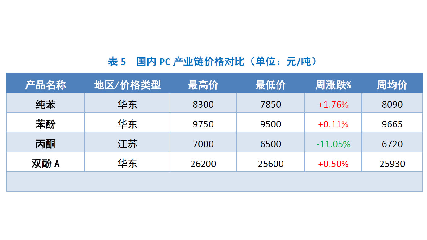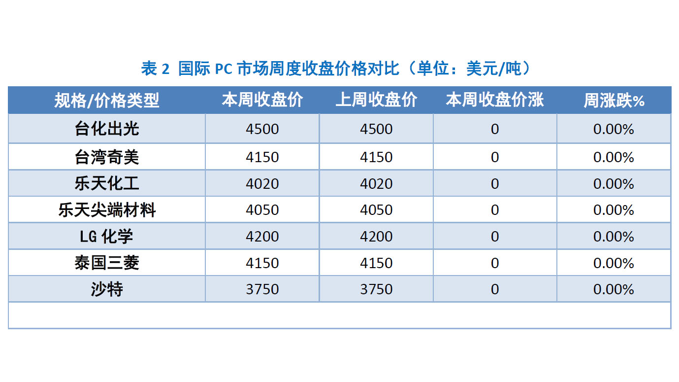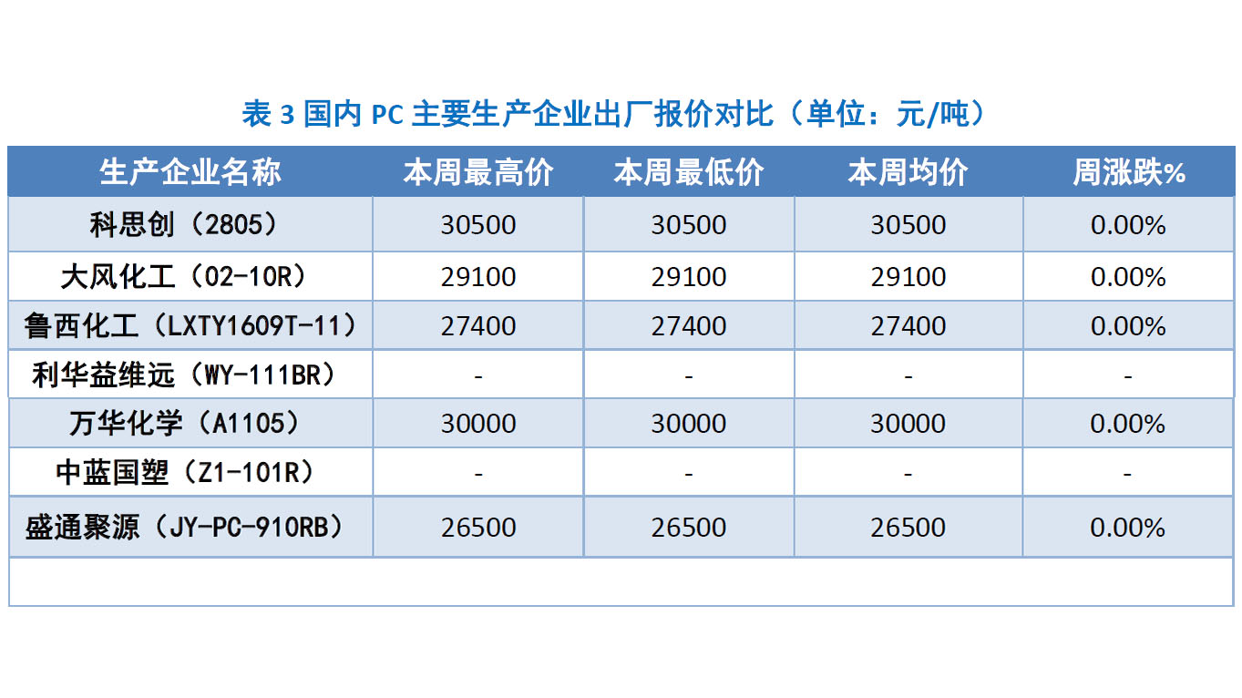 本周国内PC主要企业价格分析 本周国内PC生产企业报盘多暂稳运行。伴随原料双酚A市场报盘重心下行,国内PC市场看涨氛围回落,但PC生产企业出厂报盘仍呈倒挂边缘,出厂报盘走低压力明显,然下游终端工厂对于高价PC接受度有限,多以刚需接盘。成本及供需双重压力影响下,企业多谨慎调价,观望为主。PC供应篇