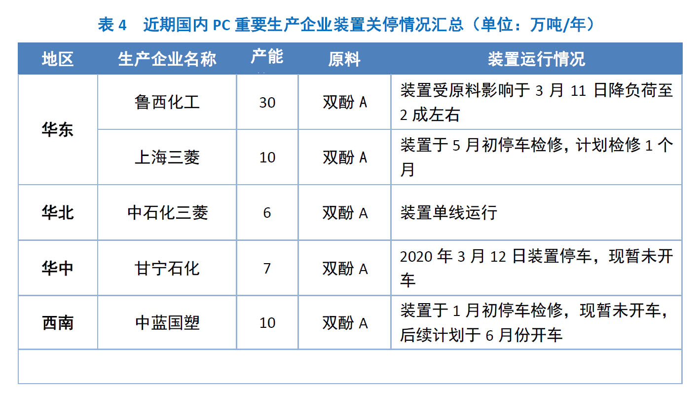本周国内PC生产企业供应分析 本周国内PC生产企业装置开工负荷均偏低。鲁西化工30万吨/年PC装置整体开工在2成左右;上海三菱10万吨/年PC装置于5月初停车检修,计划检修1个月;中石化三菱6万吨/年PC装置单线运行;甘宁石化7万吨/年PC装置已于2020年3月12日停车,现暂未开车;中蓝国塑10万吨/年PC装置1月初停车,现暂未开车,后续计划于6月份开车。PC供应篇