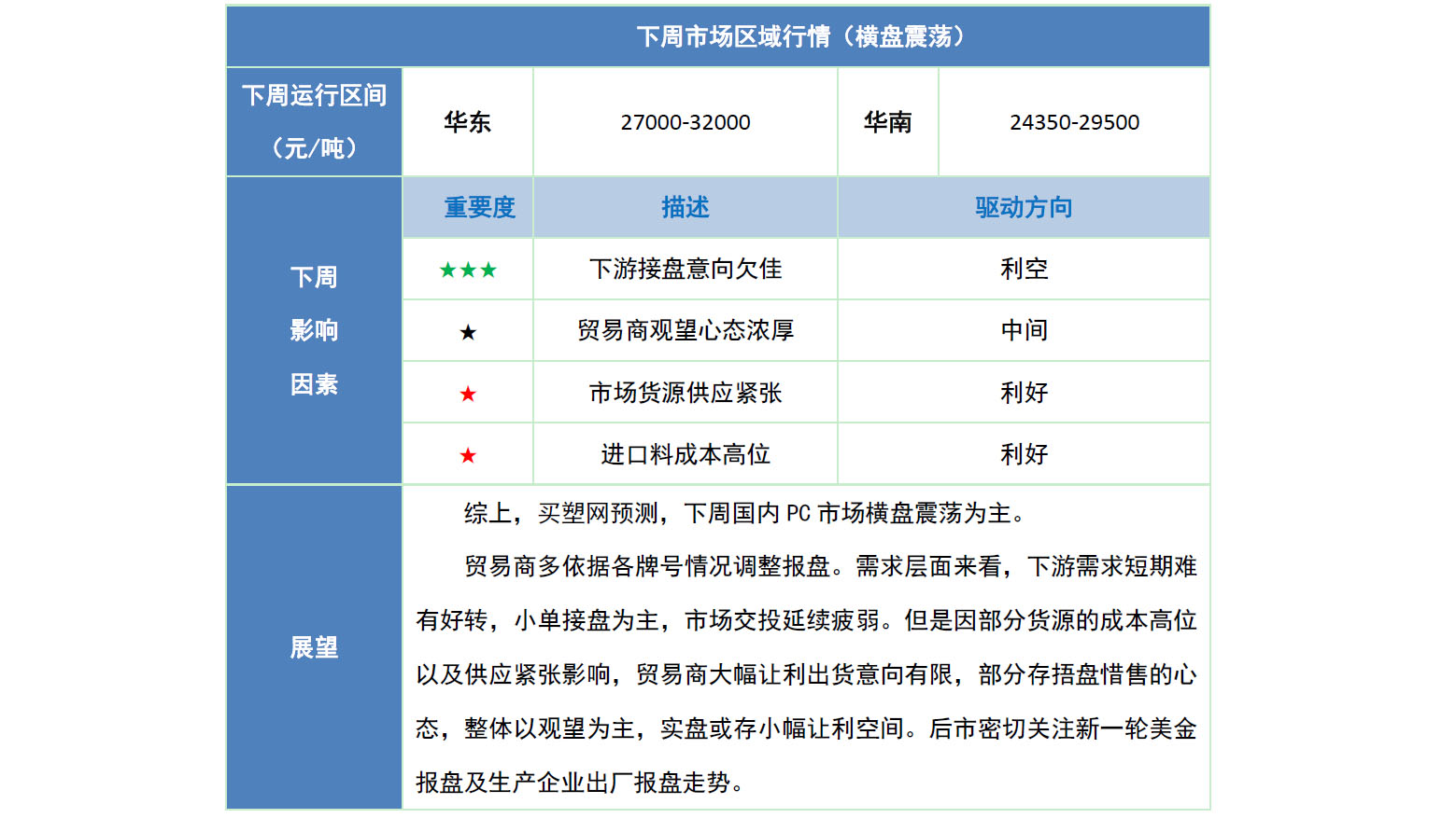 本周国内PC市场分析 本周国内PC市场偏弱震荡。分区域来看,华东市场横盘整理,各主流牌号报盘暂稳运行;华南市场小幅下行,各主流牌号跌幅在50-400元/吨。 周内市场整体观望气氛浓厚,下游延续刚需小单接盘的节奏,市场整体交投面难有好转,延续弱势。然部分进口料缺货,加之后市高价货源到港补仓,贸易商低价出货意向有限,多高位持坚。国产料方面,原料双酚A仍处高位,PC生产企业出厂持稳,部分货源供应紧张,贸易商操盘积极性欠佳,多以实盘商谈为主。市场整体买卖盘僵持博弈,静待新消息面影响。截止今日,华东注塑级中低端商谈参考27000-29700元/吨(含税),华南注塑级中低端商谈参考24350-27300元/吨(不含税)。华东地区:华东PC市场横盘整理,各主流牌号报盘暂稳运行。市场内观望气氛浓厚,高成本低需求交织影响下,贸易商操盘积极性欠佳,多持稳报盘,实盘商谈存小幅让利空间。截止今日,华东注塑级中低端商谈参考27000-29700元/吨(含税)。 华南地区:华南PC市场小幅下行,各主流牌号跌幅在50-400元/吨。下游需求面欠佳,市场整体交投欠佳,部分货源缺货明显,贸易商多依据各牌号情况报盘。截止今日,华南注塑级中低端商谈参考24350-27300元/吨(不含税)。PC市场篇