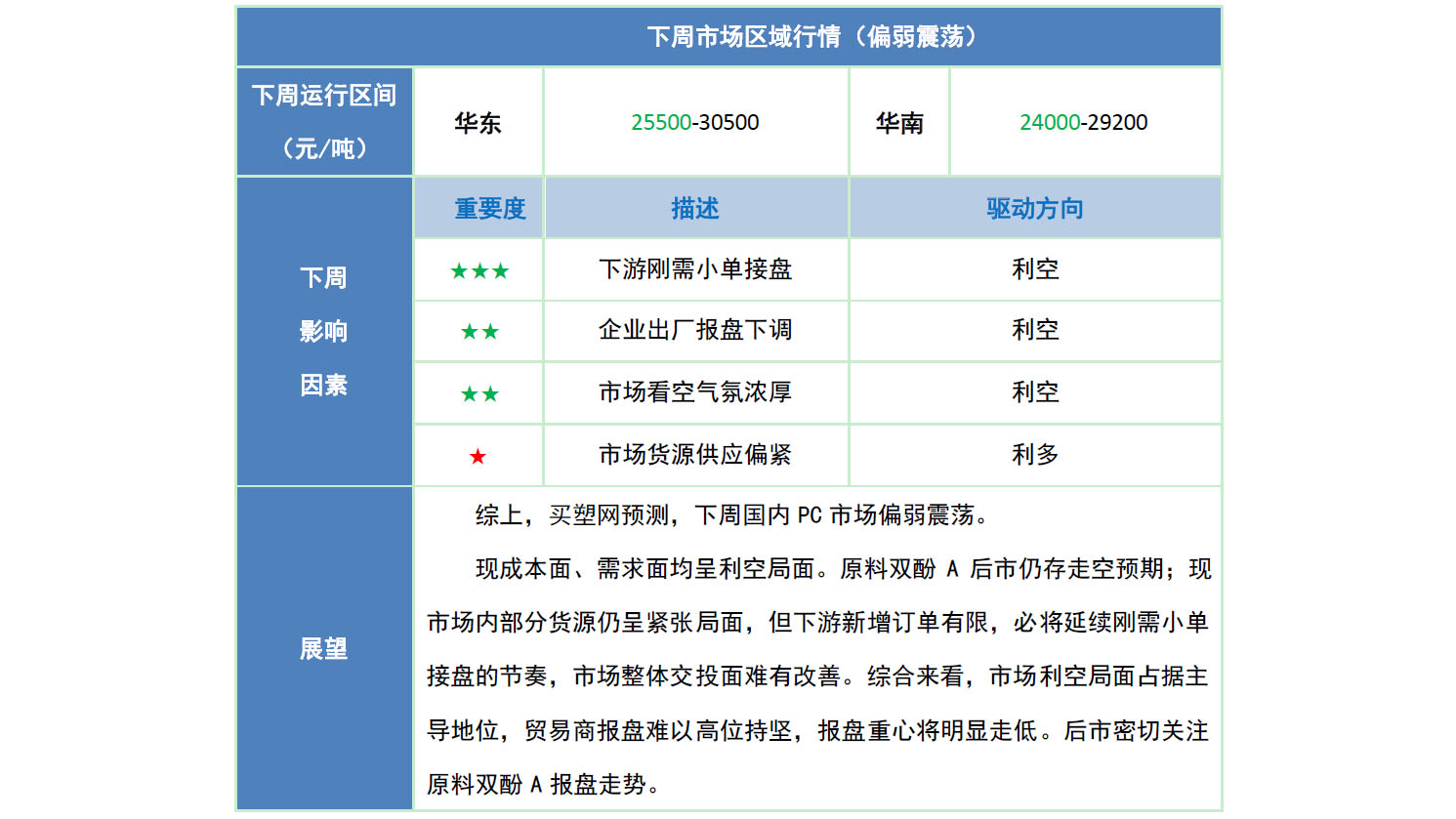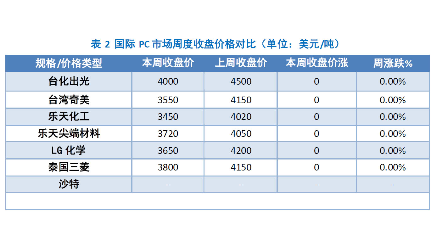 本周国内PC市场分析 本周国内PC市场持续走空。分区域来看,华东市场大幅下行,各主流牌号跌幅在550-1300元/吨;华南市场重心走低,各主流牌号跌幅在300-600元/吨。周内,原料双酚A报盘重心持续下行,加之国内PC生产企业出厂报盘走低,成本面支撑走弱。伴随6月美金盘实盘商谈结果明朗,成本面支撑进一步走弱,市场业者对于后市看空情绪明显。下游接盘意向有限,多存买涨不买跌的心态,刚需小单接盘为主。临近周末,因原料双酚A报盘重心小幅回调,部分贸易商因现货高成本影响,报盘小幅跟涨。然交投欠佳的局面下,贸易商难有乐观心态,实盘商谈多存让利促成交的操作。截止今日,华东注塑级中低端商谈参考25900-29000元/吨(含税),华南注塑级中低端商谈参考24400-25500元/吨(不含税)。华东地区:华东PC市场大幅下行,各主流牌号跌幅在550-1300元/吨。伴随原料双酚A报盘重心大幅走低,市场内业者对于后市信心明显看空,操盘重心均有所走低。截止今日,华东注塑级中低端商谈参考25900-29000元/吨(含税)。 华南地区:华南PC市场重心走低,各主流牌号跌幅在300-600元/吨。下游需求欠佳,市场内货源供应紧张,贸易商多观望谨慎操盘。临近周末,随着原料双酚A重心小幅回调,市场内部分贸易商因现货成本影响,报盘随之跟涨,但因需求的影响,实盘商谈仍存让利空间。截止今日,华南注塑级中低端商谈参考24400-25500元/吨(不含税)。PC市场篇