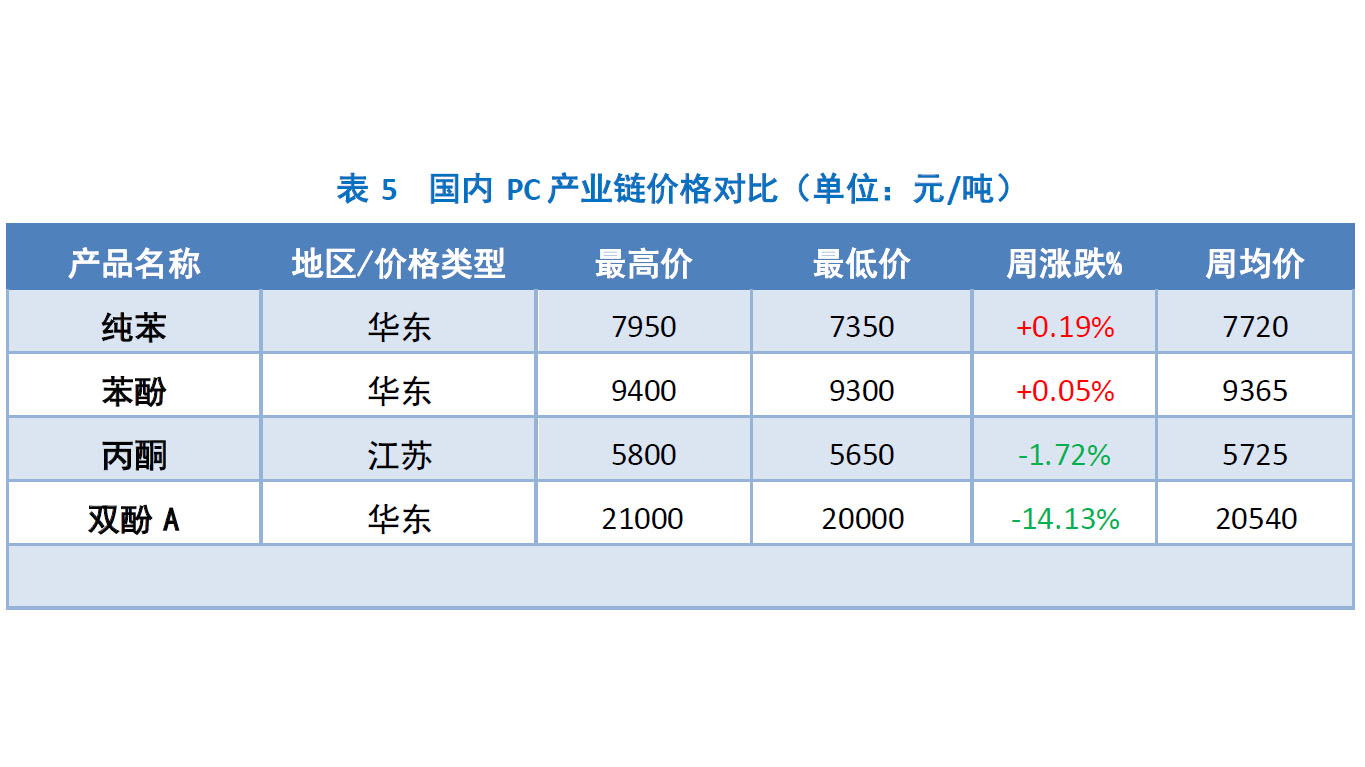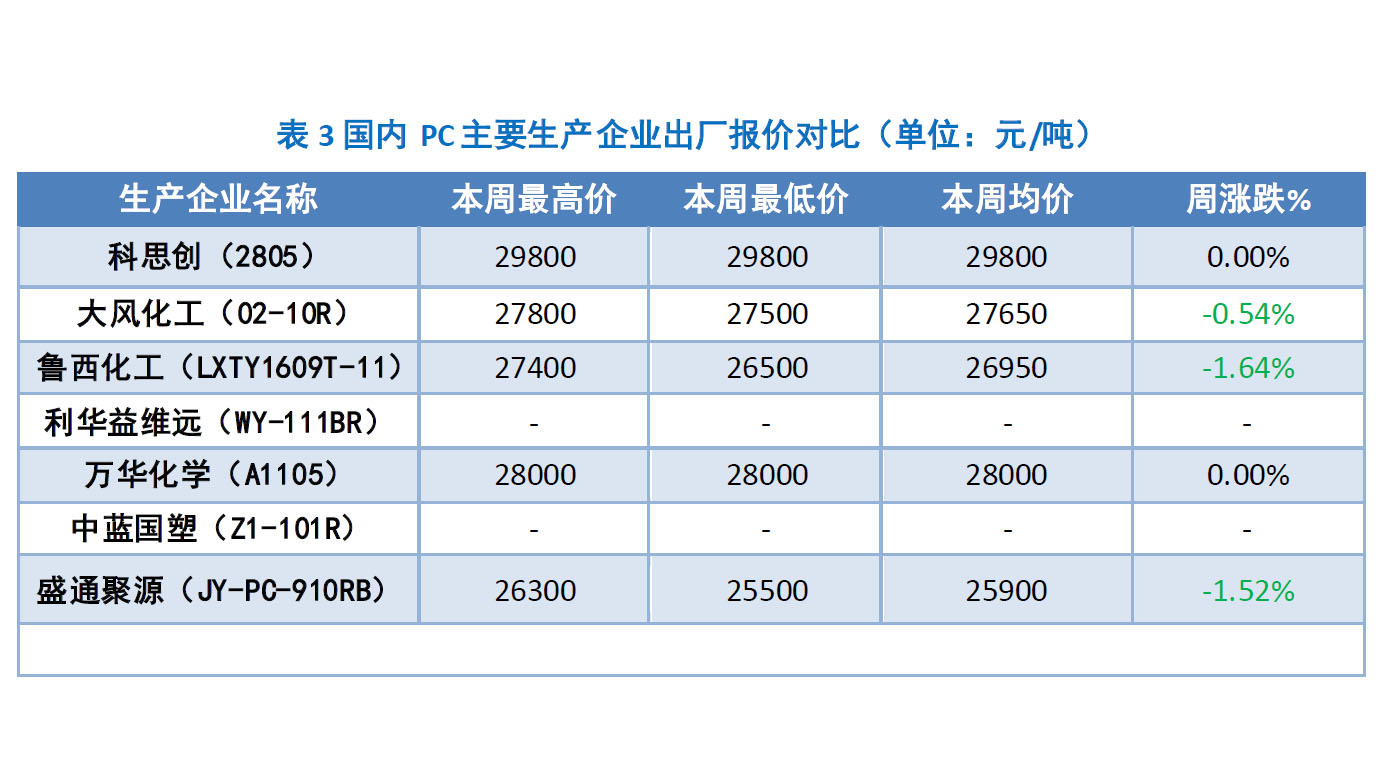 本周国内PC主要企业价格分析 本周国内PC生产企业报盘重心下调。大风化工出厂报盘下调至27500元/吨;鲁西化工出厂报盘两次下调至26500元/吨;盛通聚源出厂报盘下调至25500元/吨。原料双酚A报盘大幅走低,成本面支撑走弱,又因下游终端需求跟进欠佳,厂家出货迟缓,报盘难以高位持坚。成本及供需双重压力影响下,企业报盘重心多有所走低。PC供应篇