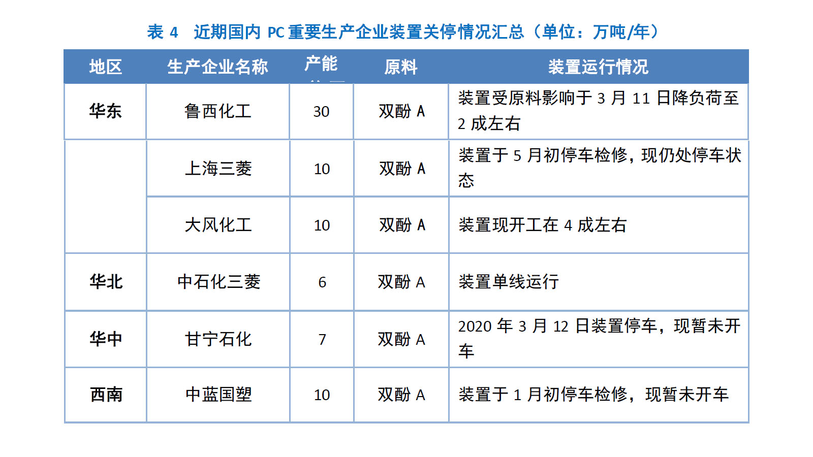 本周国内PC生产企业供应分析 本周国内PC生产企业装置开工负荷均偏低。鲁西化工30万吨/年PC装置整体开工在2成左右;上海三菱10万吨/年PC装置于5月初停车检修,现仍处停车状态;大风化工10万吨/年PC装置整体开工在4成左右;中石化三菱6万吨/年PC装置单线运行;甘宁石化7万吨/年PC装置已于2020年3月12日停车,现暂未开车;中蓝国塑10万吨/年PC装置1月初停车,现暂未开车。PC需求篇