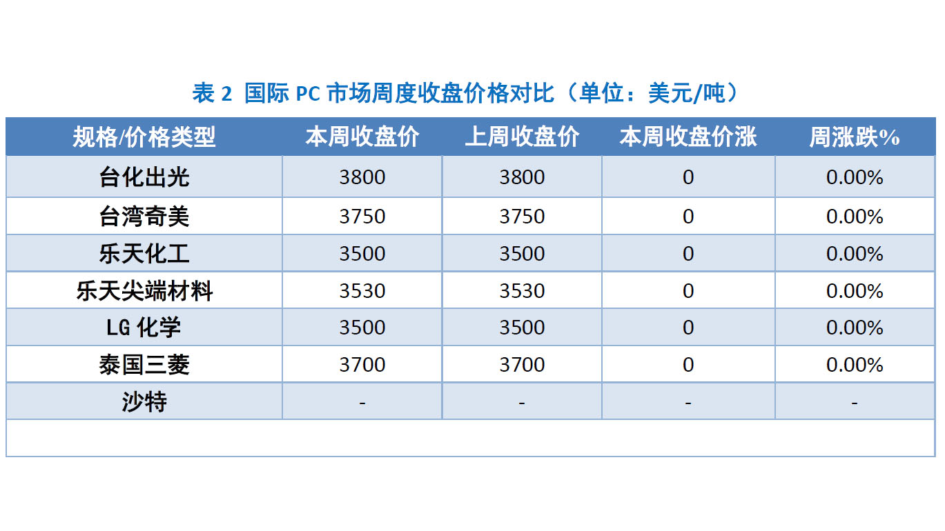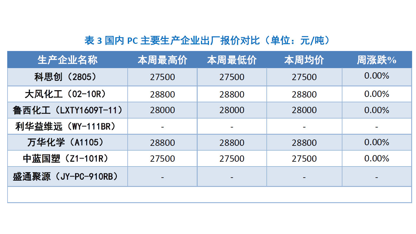 本周国内PC主要企业价格分析 本周国内PC生产企业多持稳运行,出厂报盘暂无调整。周内,原料双酚A高位持稳运行,厂家成本面仍有压力,出厂多有看涨的意向,但受限于下游终端工厂跟进欠佳,以及PC市场看涨气氛有限,多以持稳运行为主。出厂报盘难以有所上调,整体多以稳运行。PC供应篇