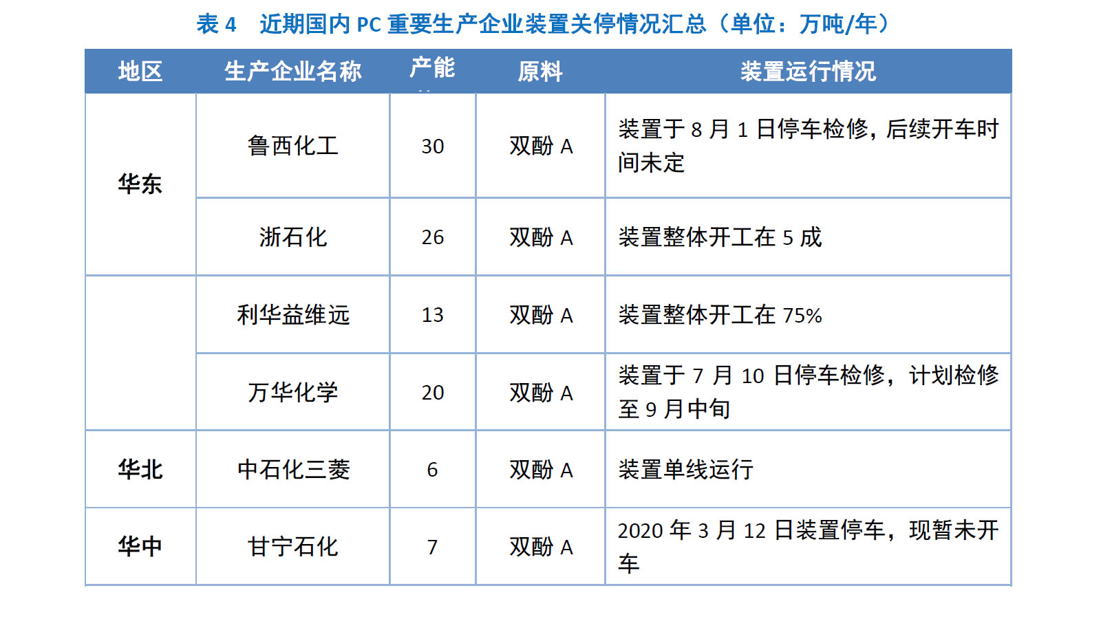 本周国内PC生产企业供应分析 本周国内PC生产企业装置开工负荷均偏低。鲁西化工30万吨/年PC装置于8月1日停车检修,后续开车时间未定;万华化学20万吨/年PC装置于7月10日停车检修,计划检修至9月中旬;浙石化26万吨/年PC装置现稳定运行,整体开工在5成左右;利华益维远13万吨/年PC装置整体开工在75%;中石化三菱6万吨/年PC装置单线运行;甘宁石化7万吨/年PC装置已于2020年3月12日停车,现暂未开车。PC需求篇
