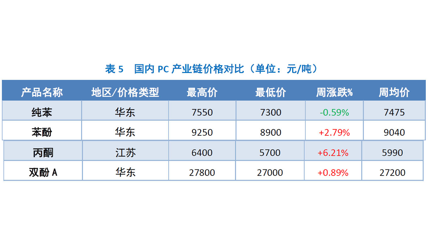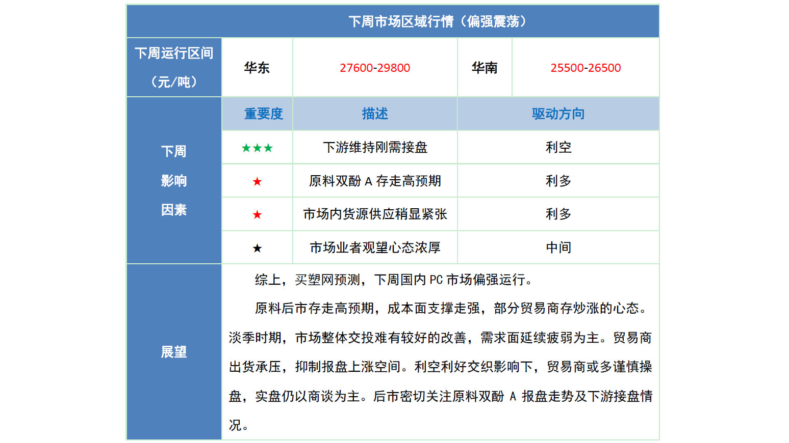 本周国内PC市场分析 本周国内PC市场偏强震荡。分区域来看,华东市场整体以稳为主,各主流牌号横盘运行,部分牌号报盘小幅上调200-400元/吨;华南市场偏强震荡,各主流牌号涨幅在200-500元/吨,部分牌号因前期价高影响,周内跌幅达600元/吨。 周内,市场整体消息面匮乏,原料双酚A高位持坚报盘,PC生产企业出厂多以稳为主,贸易商操盘积极性欠佳,多以观望操盘为主。下游观望心态浓厚,接盘维持刚需跟进,市场交投欠佳。贸易商多依据各牌号情况调整报盘,实盘商谈多存让利空间。临近周末,伴随原料双酚A报盘走高,市场内部分贸易商存看涨心态,报盘存小幅拉涨。但整体心态仍以谨慎为主。截止今日,华东注塑级中低端商谈参考27500-28500元/吨(含税),华南注塑级中低端商谈参考25250-25700元/吨(不含税)。华东地区:华东PC市场整体以稳为主,各主流牌号横盘运行,部分牌号报盘小幅上调200-400元/吨。下游刚需跟进,原料高位支撑,利好利空面交织影响。市场消息面匮乏,贸易商操盘积极性欠佳,多观望操盘。截止今日,华东注塑级中低端商谈参考27500-28500元/吨(含税)。 华南地区:华南PC市场偏强震荡,各主流牌号涨幅在200-500元/吨,鲁西化工的料子因前期货紧价高,周内跌幅高达600元/吨。原料双酚A高位支撑,需求虽跟进欠佳,然商家仍无大幅让利出货的意向。临近周末,伴随原料双酚A报盘调涨,市场内多有看涨气氛。截止今日,华南注塑级中低端商谈参考25250-25700元/吨(不含税)。PC市场篇