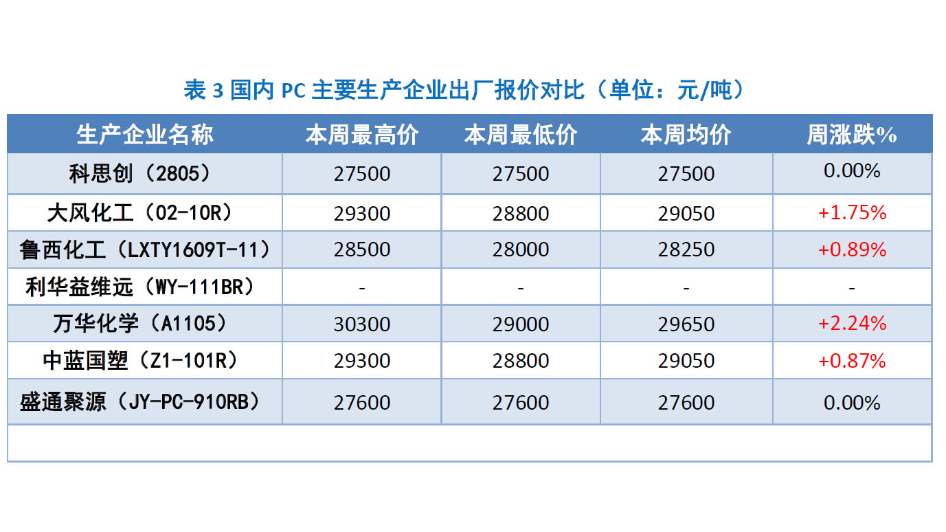 本周国内PC主要企业价格分析 本周国内PC生产企业多有调涨。大风化工出厂报盘调涨至29300元/吨;鲁西化工出厂二度调涨至28500元/吨;万华化学出厂报盘调涨至30300元/吨;利华益维远出厂调涨500元/吨;中蓝国塑出厂调涨至29300元/吨。原料双酚A高位运行,厂家成本压力明显,但淡季行情影响下,需求有限,厂家持续上涨动力有限,多谨慎小幅上调试探市场。后市或存继续走高的预期。PC供应篇