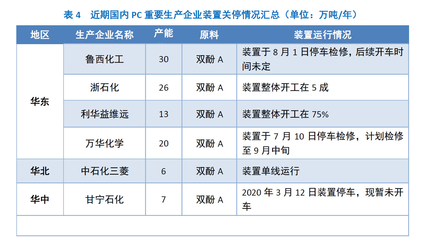 本周国内PC生产企业供应分析 本周国内PC生产企业装置开工负荷均偏低。鲁西化工30万吨/年PC装置于8月1日停车检修,后续开车时间未定;万华化学20万吨/年PC装置于7月10日停车检修,计划检修至9月中旬;浙石化26万吨/年PC装置现稳定运行,整体开工在5成左右;利华益维远13万吨/年PC装置整体开工在75%;中石化三菱6万吨/年PC装置单线运行;甘宁石化7万吨/年PC装置已于2020年3月12日停车,现暂未开车。PC需求篇