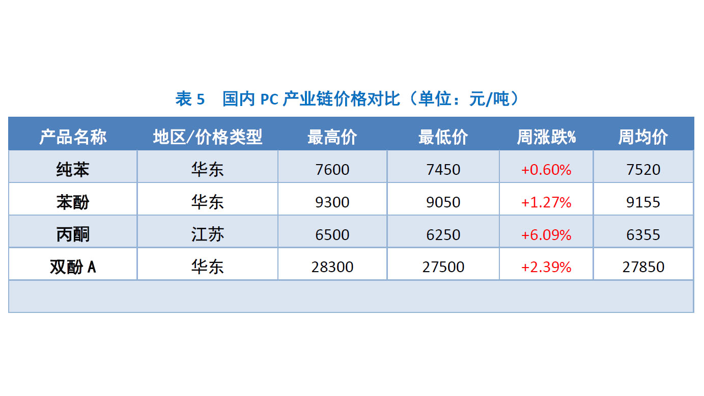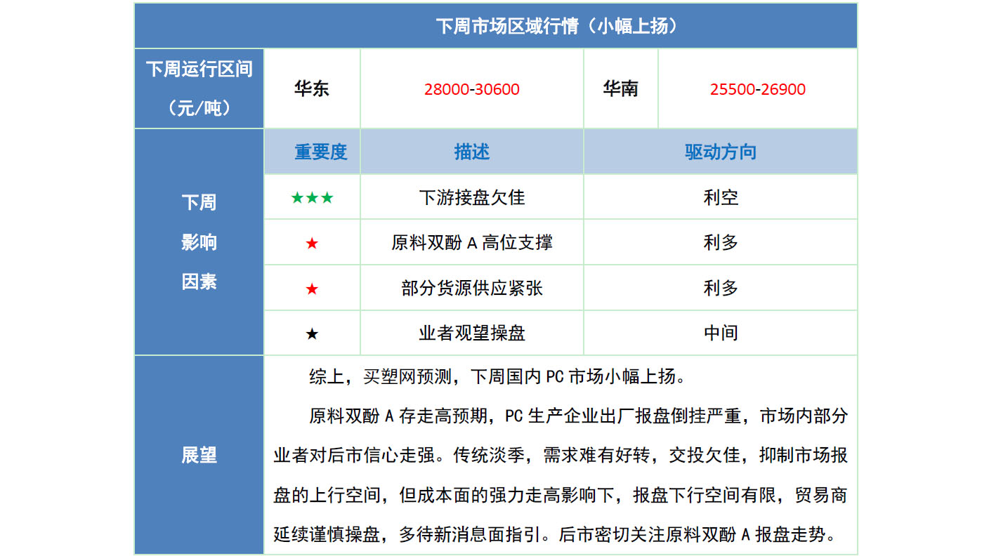 本周国内PC市场分析 本周国内PC市场偏强运行。分区域来看,华东市场小幅上行,各主流牌号涨幅在300-600元/吨;华南市场偏强震荡,各主流牌号涨幅在100-400元/吨。 周内,原料双酚A报盘存小幅走高,国内PC生产企业出厂报盘均有所调涨,部分生产企业出厂涨幅更是高达1300元/吨。但淡季行情影响下,加之现PC市场报盘处相对高位,下游工厂成本面的压力明显,接盘意向有限,维持刚需接盘的节奏,贸易商出货多有压力。成本面及需求面的双重影响下,贸易商操盘积极性欠佳,多依据各牌号情况调整报盘,国产料市场价直逼进口料价格。临近周末,伴随原料双酚A高位上扬,带动市场部分贸易商的看涨心态,但操盘仍显谨慎。截止今日,华东注塑级中低端商谈参考27800-29000元/吨(含税),华南注塑级中低端商谈参考25300-25900元/吨(不含税)。 华东地区:华东PC市场小幅上行,各主流牌号涨幅在300-600元/吨。下游刚需跟进,原料高位支撑,利好利空面交织影响。市场消息面匮乏,贸易商操盘积极性欠佳,多观望操盘。截止今日,华东注塑级中低端商谈参考27800-29000元/吨(含税)。 华南地区:华南市场偏强震荡,各主流牌号涨幅在100-400元/吨。原料双酚A高位支撑,需求虽跟进欠佳,然商家仍无大幅让利出货的意向。临近周末,伴随原料双酚A报盘调涨,市场内多有看涨气氛。截止今日,华南注塑级中低端商谈参考25300-25900元/吨(不含税)。PC市场篇