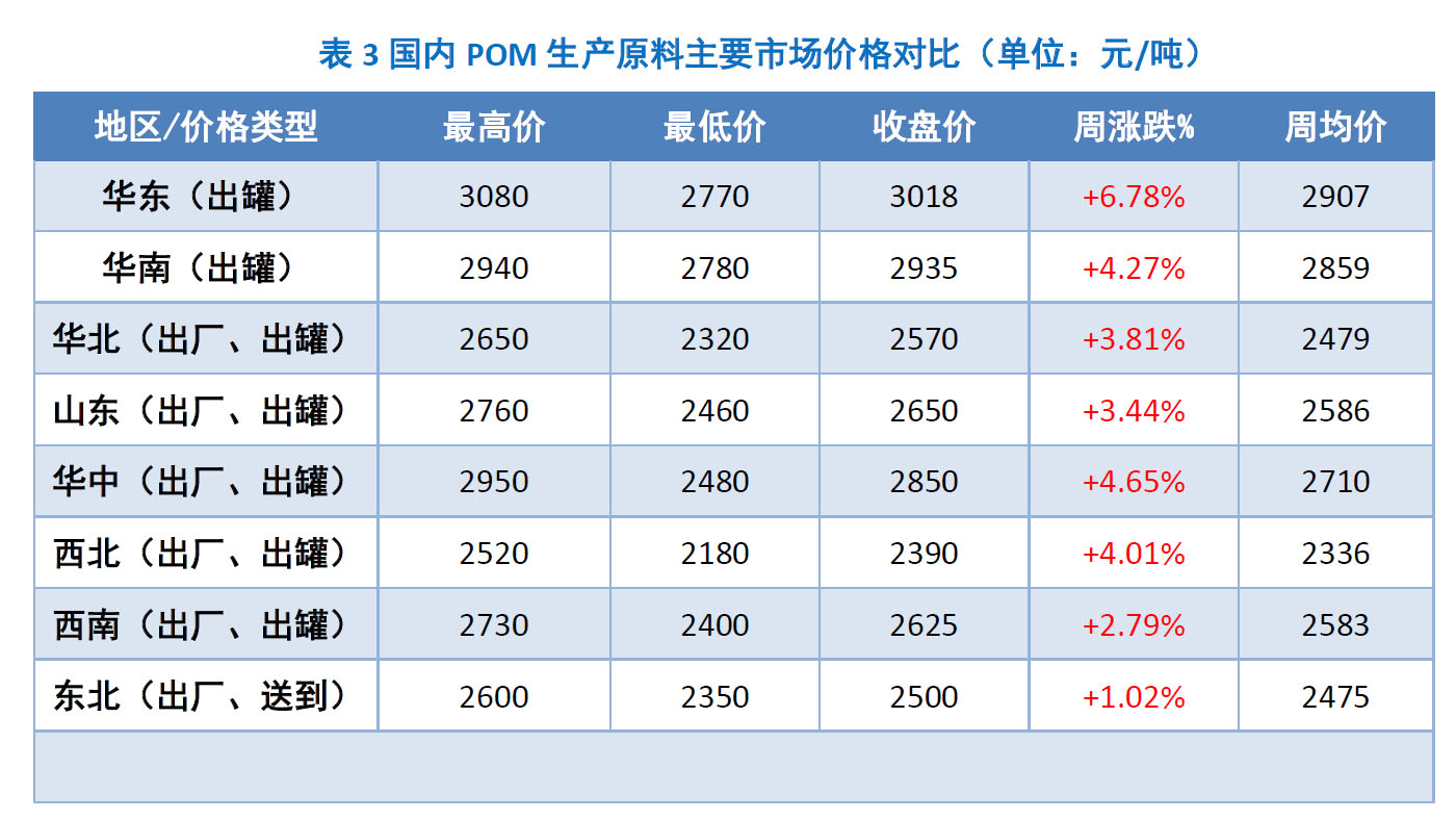 国内POM市场走势分析 本周国内POM市场大幅走高。周内上游原料甲醇市场报盘走高,POM国产料市场报盘大幅上扬,进口料市场高位小幅上涨。 周内,国内POM生产企业出厂报盘走高,成本面支撑走强,加之市场内整体货源供应仍显紧张。但下游多零星刚需操盘,市场整体交投一般。利好局面占据主导地位,贸易商多存看涨的预期。现市场内报盘杂乱,部分货紧牌号难有主流价格,贸易商操盘多谨慎,实盘以一单一谈为主。截至9月9日(周四)午后14:00,华东余姚市场云天化M90含税参报21000-22000元/吨,华南东莞市场无税参报19800-19900元/吨。国内POM主要生产原料市场分析