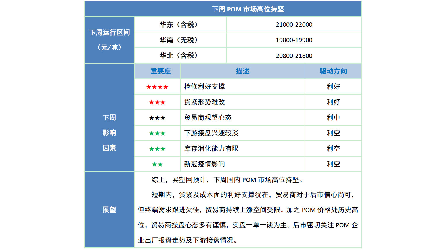 国内POM市场走势分析 本周国内POM市场大幅走高。周内上游原料甲醇市场报盘走高,POM国产料市场报盘大幅上扬,进口料市场高位小幅上涨。 周内,国内POM生产企业出厂报盘走高,成本面支撑走强,加之市场内整体货源供应仍显紧张。但下游多零星刚需操盘,市场整体交投一般。利好局面占据主导地位,贸易商多存看涨的预期。现市场内报盘杂乱,部分货紧牌号难有主流价格,贸易商操盘多谨慎,实盘以一单一谈为主。截至9月9日(周四)午后14:00,华东余姚市场云天化M90含税参报21000-22000元/吨,华南东莞市场无税参报19800-19900元/吨。POM市场篇
